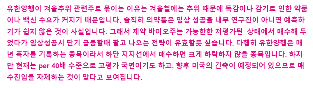 유한양행은 의약품, 화학약품, 공업약품, 수의약품, 생활용품 등의 제조 및 매매를 영위하는 기업으로 주요 제품은 아토르바, 삐콤씨 및 유한락스, 바이오 오일 등이 있습니다. 유한양행은 아토르바, 메로펜, 프리베나 등 오리지널 의약품을 도입 판매하는 한편 다국적 제약사 길리어드의 C형 간염 치료제에 들어가는 원료를 수출하였습니다. 유한양행은 레이저티닙이 타그리소 내성 환자 대상 우수한 반응률을 보인 만큼 내년 가속 승인을 통한 글로벌 시장 진출이 기대 됩니다.
