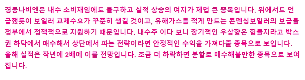 몇개월전 경동나비엔 주가가 급등한 이유는 콘덴싱 보일러 때문입니다. 콘덴싱 보일러는 외부로 빠져나가는 열을 모아 다시 활용하는 친환경·고효율 보일러를 말합니다. 에너지 효율이 95% 이상으로 일반 보일러(약 80%)보다 높고, 유해가스도 적게 만듭니다.판매사가 누리는 마진율은 일반 보일러보다 콘덴싱 보일러가 더 높습니다. 콘덴싱 보일러 보급률은 20% 정도에 불과해 추가 판매 여지도 큽니다. 정부가 지난 4월 ‘대기오염물질저감을위한특별법’을 통해 콘덴싱 보일러 사용을 의무화했습니다.
