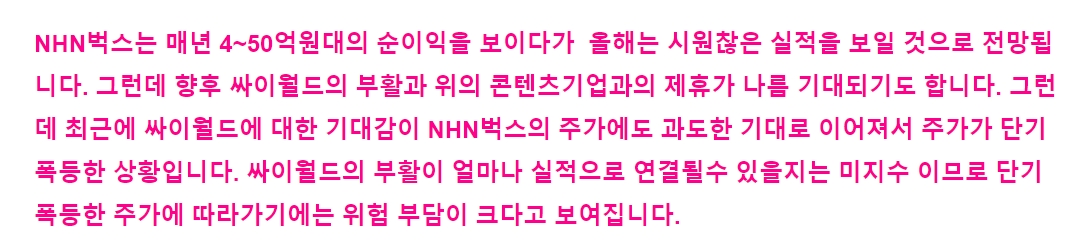NHN벅스 주가가 급등하는 이유는 내달 17일 서비스를 시작하는 싸이월드에 대한 기대감이 반영된 것으로 보입니다. NHN벅스는 레드나인픽쳐스, 제나두엔터테인먼트와 뮤직시네마 '사운드트랙#1' 제작 계약을 체결했다고 밝혔습니다. NHN벅스는 이번 계약을 통해 벅스의 음악 서비스 노하우와 레드나인픽쳐스와 제나두엔터테인먼트의 영상 및 음악 콘텐츠 제작 역량을 결합한 신개념 뮤직시네마를 선보일 방침입니다.