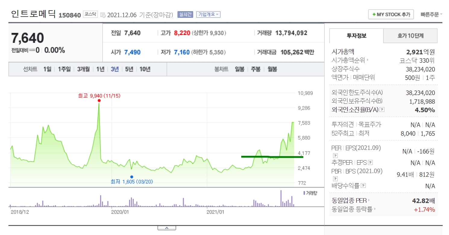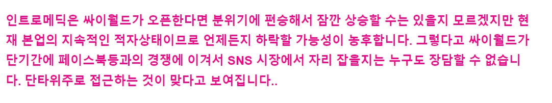 인트로메딕은 지난달 30일 싸이월드 운영사 싸이월드제트(싸이월드Z)의 유상증자에 참여해 싸이월드Z의 최대주주로 등극했다고 밝혔습니다. 그래서 최근에 주가가 단기 급등하였습니다.