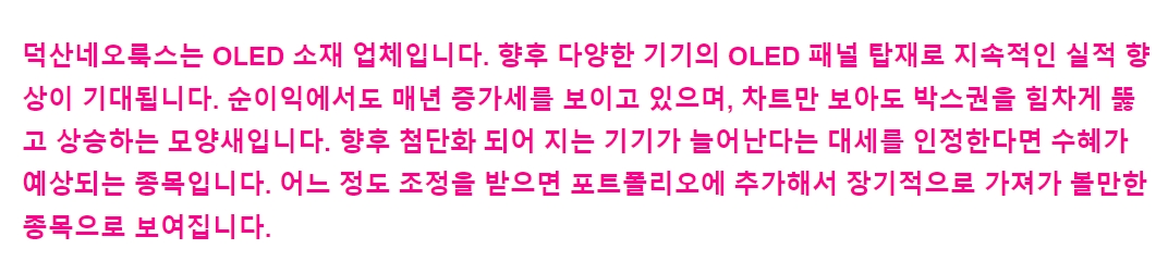 삼성디스플레이는 OLED 패널 생산 어플리케이션을 스마트폰 중심에서 노트북, TV 등으로 확대시키고 있습니다. 4분기 삼성디스플레이는 QD OLED TV 양산을 계획하고 있으므로 덕산네오룩스 입장에서는 기존 모바일용 패널 중심에서 대형 TV 패널까지 공급 가능 어플리케이션이 확장되면서 3분기부터 매출이 한 단계 레벨업될 수 있습니다.
