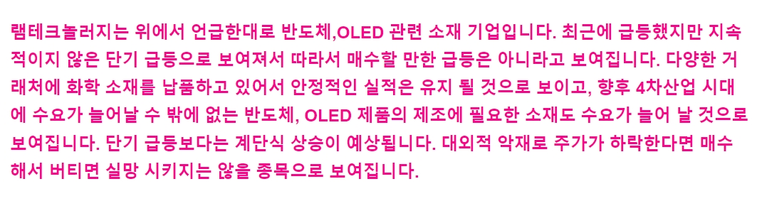 램테크놀러지는 반도체, 디스플레이, 정보 기술, 기타 산업에 사용되는 유기 화학 소재를 제조, 판매하는 한국 기반 회사입니다. 회사는 주로 습식 세정, 웨이퍼 텍스처링, 확산 공정, 레이어 식각, 필름 제거, 이차전지 용매 등에 적용되는 화학 소재를 생산합니다. 최근 급등은 미국에서 반도체주 업황이 좋아지면서, 국내 관련 업체에서도 낙수효과가 나타날 수 있을 것이라는 전망에 반도체 관련주로 분류된 램테크놀러지가 영향을 받은 것으로 풀이됩니다.