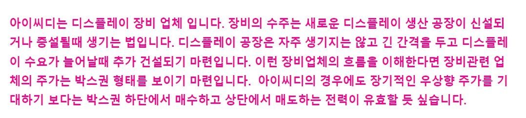 아이씨디는 주로 반도체 장비를 제조, 판매하는 한국 기반 회사입니다. 아이씨디의 제품 포트폴리오는 건식 식각기, 고밀도 플라즈마 식각기, 플라즈마 박리기, 플라즈마 세정기, 건식 식각기, 고밀도 플라즈마 식각기 부품 등으로 구성되어 있습니다. 회사 장비는 플랫 패널 디스플레이, 박막 트랜지스터 액정 디스플레이, 능동형 유기 발광 다이오드와 같은 디스플레이에 사용됩니다.