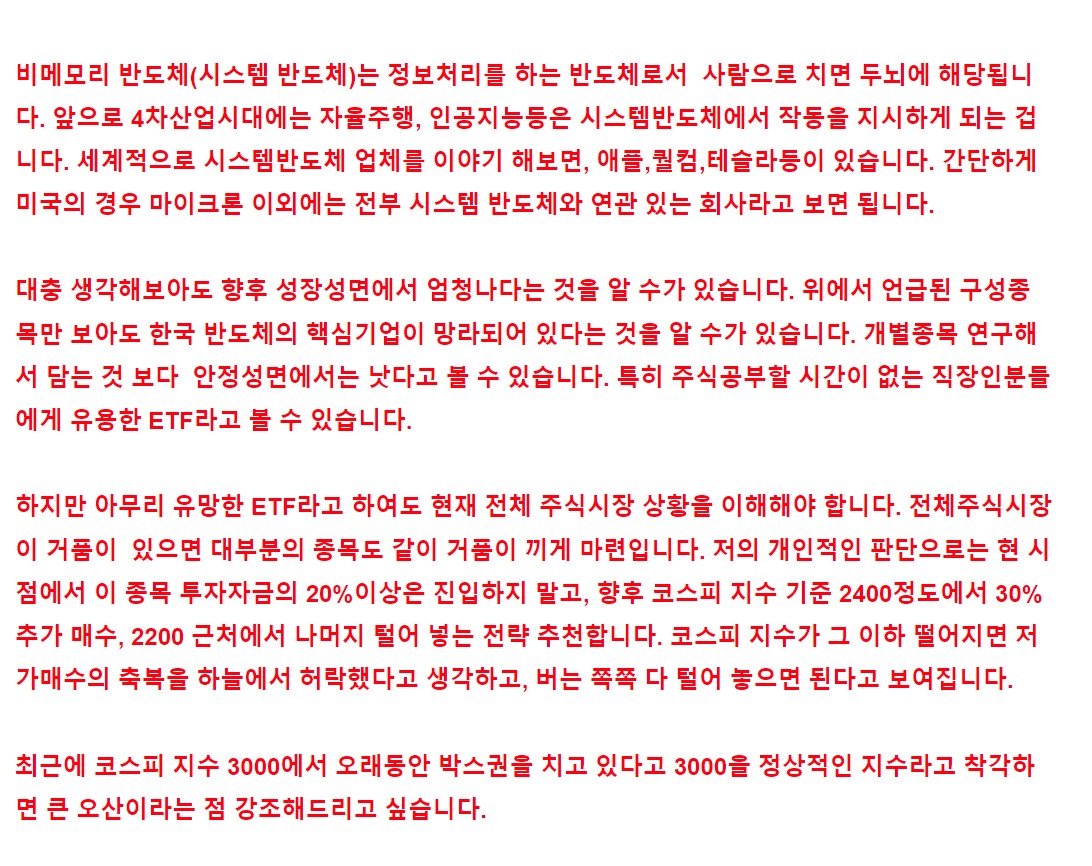 ‘KBSTAR비메모리반도체액티브ETF’는 주식형 액티브 ETF로 글로벌 반도체 시장에서 74% 비중을 차지하는 시스템 반도체 관련 국내 주식에 투자합니다. 이 상품의 벤치마크인 ‘iSelect 비메모리반도체지수‘는 유가증권시장과 코스닥 시장에 상장된 보통주 가운데 비메모리반도체 산업 전반에 걸친 종목으로 구성돼 있습니다. 지수 구성 종목을 살펴보면 종합반도체 1위인 삼성전자 12.9%, 국내 파운드리 2위 업체인 DB하이텍 10.6%, 반도체 부품 생산기업인 리노공업 9.3% 등입니다