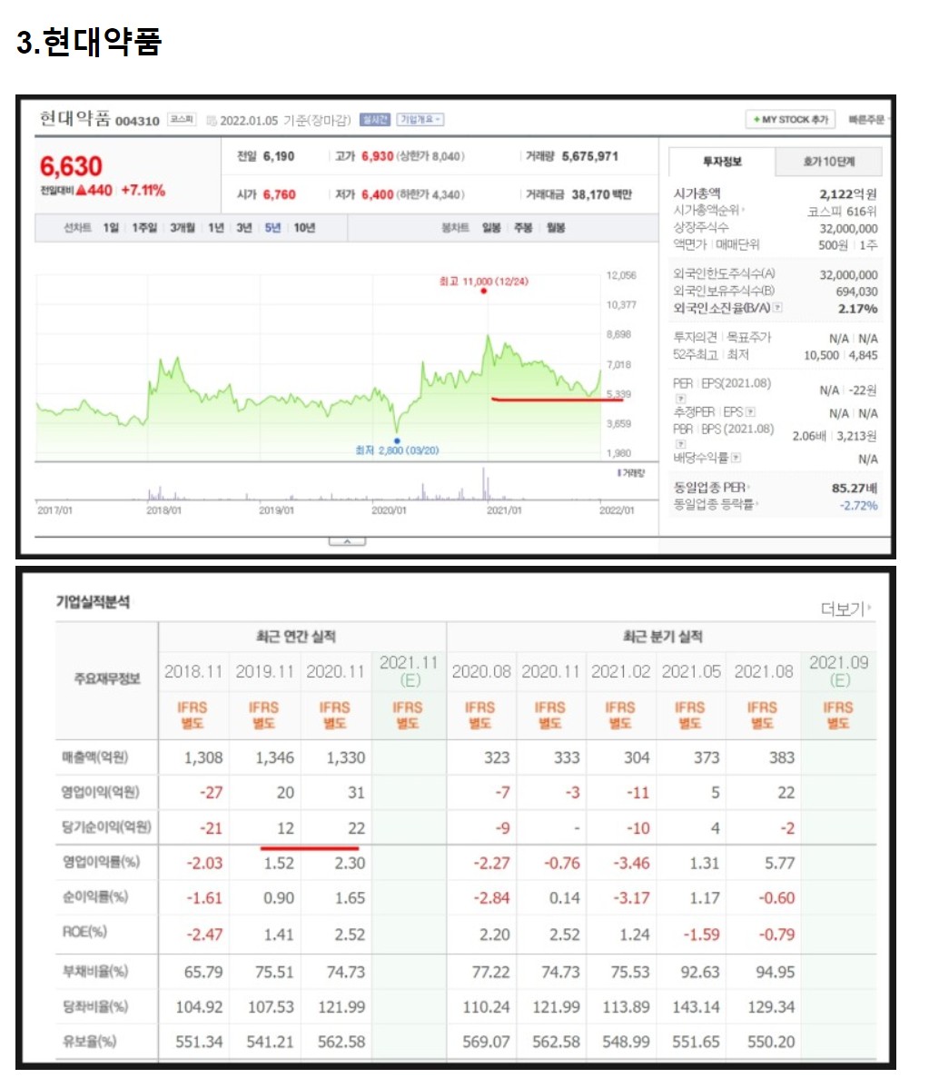 현대약품은 주로 의약품과 음료를 제조 및 판매하는 한국 기반 회사입니다. 현대약품은 주로 2개 범주의 제품을 제공합니다 - 우울증, 고혈압, 지혈 치료에 사용되는 안과 정제, 클로피도그렐 황산염, 미르타자핀 정제 등을 포함한 의약품; 비타민, 칼슘 보충제 등을 포함한 건강 기능 식품. 이는 또한 각종 식이 음료와 의료 장비를 제공합니다. 현대약품은 최근 탈모완화 샴푸 '마이녹셀'을 출시한 바 있다. 한국건설생활환경시험연구원을 통해 알레르기 유발물질 검사도 완료했습니다. 현대약품은 한국산도스와 산도스의 CNS 약물인 SSRI’s 항우울제 관련 3개 의약품 브랜드의 국내 영업에 대한 공동 프로모션 (co-promotion) 협약을 체결했다고 밝혔습니다. 그 여파로 주가가 급등한바 있습니다.