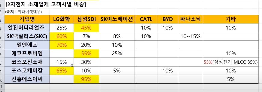 그리고 각각의 관련 소재들이 어떤 종합배터리 업체에 납품되는지도 표로 정리되어 있습니다.
