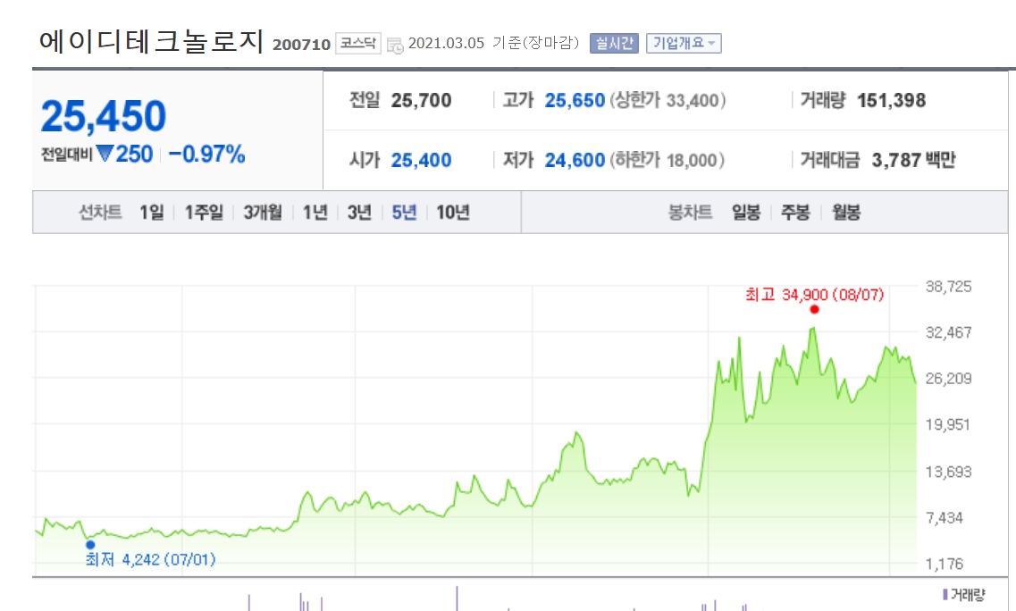 동사에이디테크놀로지는 2002년 8월 설립되어, 반도체 소자의 설계 및 제조(ASIC)를 주요 사업으로 영위함.