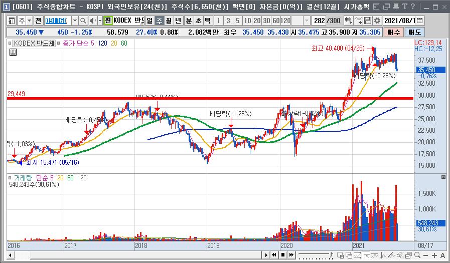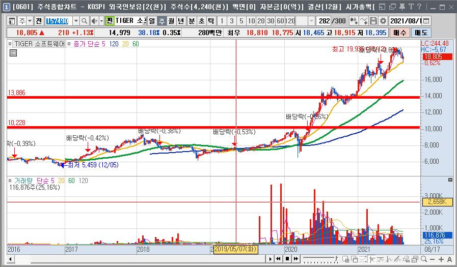 위의 ETF 는 한마디로 보물창고라고 보면 됩니다. 위의 ETF 투자 안하면 대한민국 주식은 투자할 종목이 없다고 보시면 됩니다. 하지만 아무리 좋은 종목이라고 해도 고평가 되어 있을경우에는 고민을 해봐야 합니다. 지금 코로나 펜데믹으로 인한 불황을 타개하고자 돈이 엄청나게 풀려 있어서 현재 주가가 많이 거품상태입니다. 지금 투자의 적기는 아닙니다. 제가 차트에 빨간줄을 그어놓았는데 그 선을 중심으로 위로 한번,선에 한번, 밑에서 한번 이렇게 3번분할 매수하세요..몇년내에 금리인상하고 돈줄 쪼이면 위의 자리는 반드시 오게 되어 있습니다.단타는 알아서 판단하시고, 장기 투자자는 저의 말을 명심하세요.