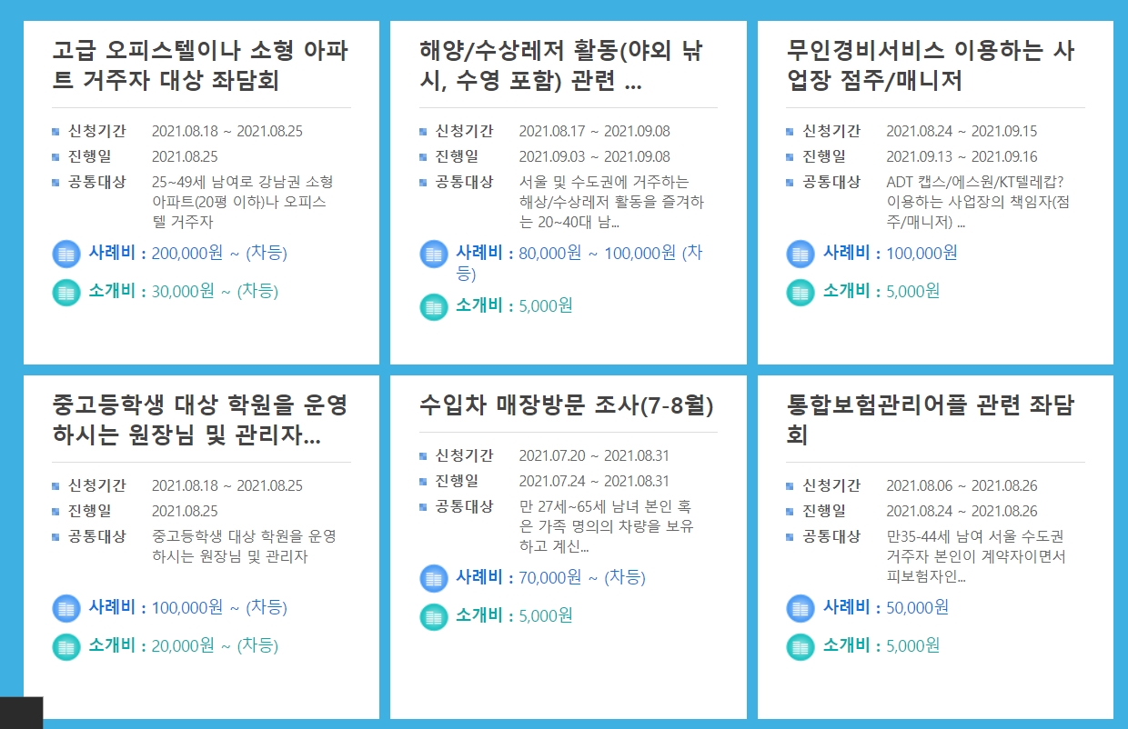 좌담회조사는 직접 참석해서 하는 건데 , 사례비가 제법 큽니다. 그냥 일반 아르바이트보다 낫습니다. 그런데 대부분 수도권이라서 아쉽습니다. 관심있는 분야의 좌담회라면 재미와 돈을 같이 취할 수 있을 것 같습니다.