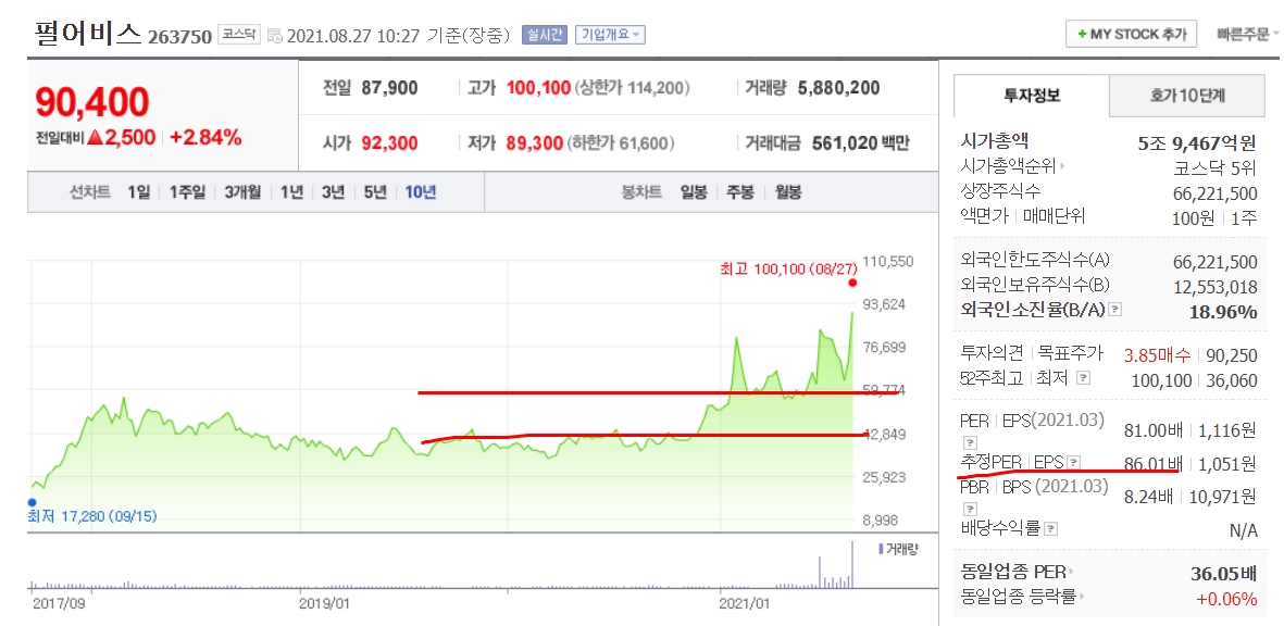 펄어비스주가가 도깨비의 큰 호응에 말미암아 단기간에 급등한 상황입니다. 전문가들 사이에서 그래픽이나 이펙트 , 캐릭터, 스토리 모든것이 압도적이라는 평가가 많습니다. 그러나 주가가 다소 밸류에이션이 높습니다. PER 80배 정도가 되네요. 지금 현재 급등상태에서 매수하기는 부담스러운 자리입니다. 현재의 급등이 조정을 받으면 분할매수로 대응하는 것이 안전할듯 싶습니다. 하단 지지층이 탄탄하고 매년 10%이상 흑자를 내는 기업이니 분할매수로 대응한다면 손해볼일은 없을 만한 기업입니다. 간혹가다가 특정 호재로 급등해서 짜릿한 수익을 줄 수도 있는 주식입니다.