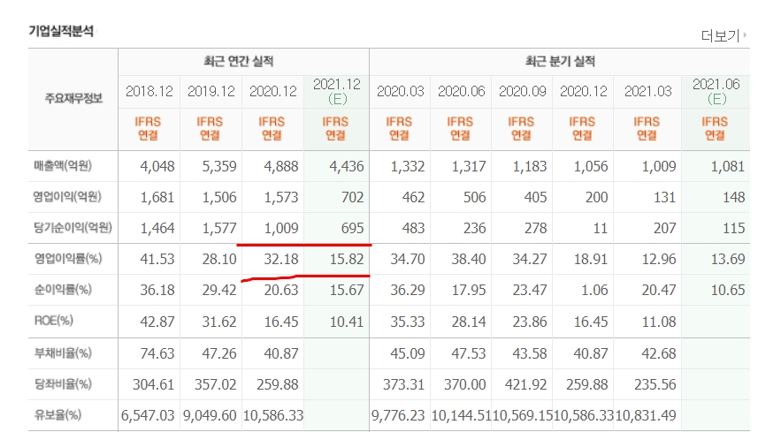 펄어비스의 실적을 보면 작년에는 1000억원 정도 되었으나, 올해는 700억 정도 됩니다. 실적이 올해는 많은 하락이 예상됩니다. 그리고 영업이익율은 항상 꾸준하게 나왔지만, 올해는 조금 하락이 예상됩니다. 하지만 주식은 현재 실적이 아니라 미래의 꿈이 더 주가에 크게 반영되기 마련입니다. 현재 주가가 폭등하는 것은 메타버스게임 도깨비가 엄청난 호평을 받고 있기 때문입니다.