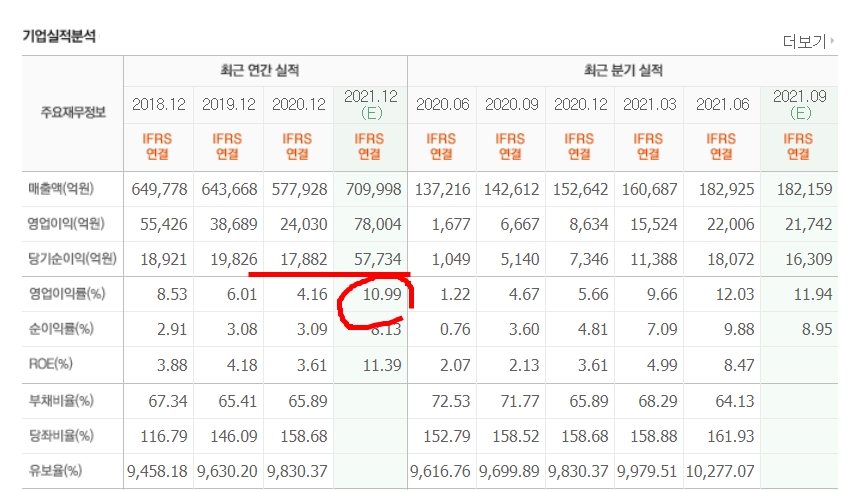 POSCO는 작년 실적이 1조 7000억원 이었지만, 올해는 5조 7000억원으로 급등을 예상하고 있습니다. 위에서 언급하다시피 전방산업의 회복이로 인해서 철강수요가 급증하였기 때문입니다.