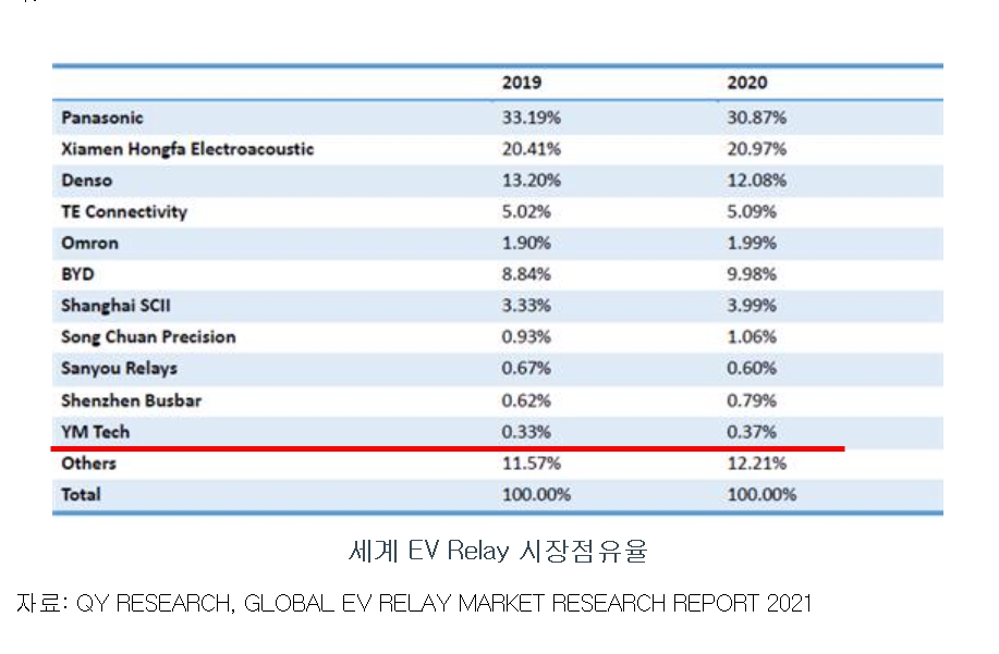 와이엠텍은 EV 릴레이의 개발에 성공하여 점진적으로 두각을 나타내고 있는 상황입니다. 위의 매출 부분을 보면 2019년 120억원, 2020년 170억원, 2021(예상) 260억원으로 점진적으로 매출증가 추이를 나타내고 있습니다. 와이엠텍의 성장성의 바탕에는 전기차와 에너지저장장치 부분인 2차전지 핵심부품 생산 업체라는 점입니다. 전기차 영역의 향후 성장 가능성은 굳이 논할 필요가 없는 부분입니다. 삼성SDI, LG에너지솔루션, SK이노베이션, 시그넷이브이 등이 주요 거래처입니다.