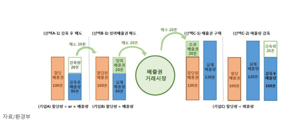 탄소배출권이란 정부가 경제 주체들을 대상으로 배출허용총량(cap)을 설정하면, 대상 기업체는 정해진 배출허용범위 내에서만 온실가스를 배출할 수 있는 권리, 즉 배출권(permit)을 부여 받게 됩니다. 배출권은 정부로부터 할당 받거나 구매할 수 있으며,대상 기업체들 간에 거래(trade)할 수 있습니다.