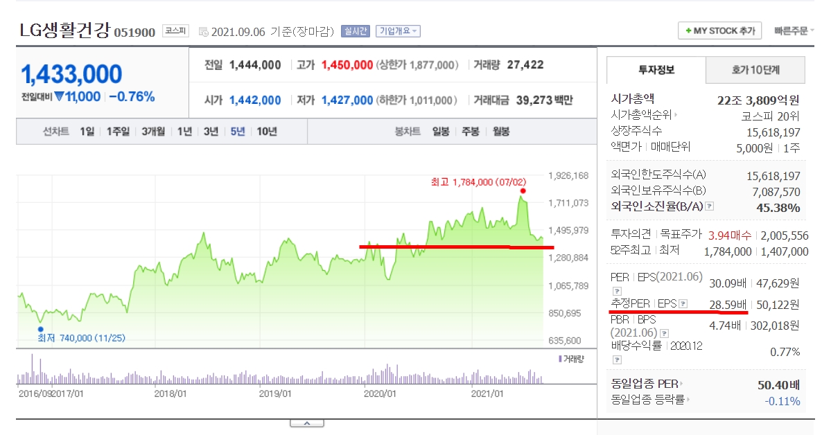 늘 꾸준한 실적 성장세와 주가를 이어가던 LG생활건강는 위와 같은 사정으로 말미암아 조정을 받고 있는 상황입니다. 주가는 급등후에는 늘 조정이 따르기 마련입니다. 그리고 밸류에이션도 조금은 고평가 구간인 것은 맞습니다. 그리고 현재 저금리기조로 말미암아 많이 풀린 돈으로 인해서 주식시장 주가가 많이 오른 상태입니다.