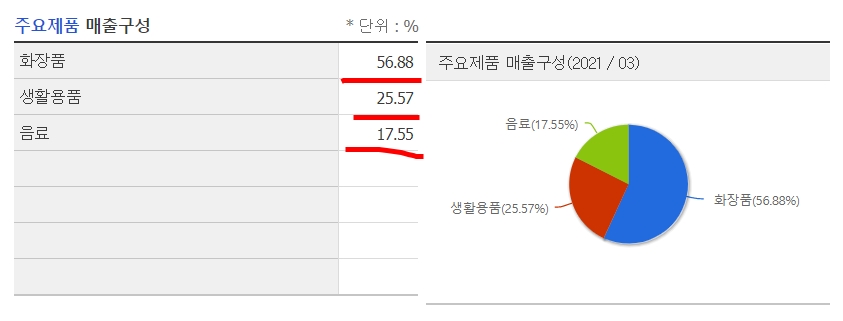 주요제품 매출 구성을 보면 화장품이 56%대, 생활용품이 25%대, 음료 부문이 17%정도 됩니다. 영업이익률은 화장품이 30%대 나머지 부문의 영업이익률이 13%대 입니다.