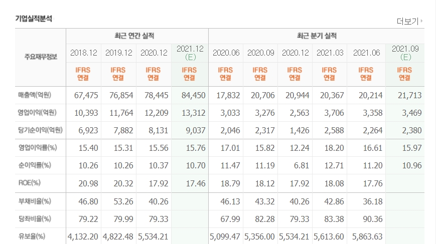LG생활건강의 실적입니다. 코로나상황하에서도 어마어마한 실적을 꾸준히 유지하고 있습니다. 15%대 영업이익률이면 대기업치고는 상위 1%대를 유지하고 있다고 보면 됩니다. 이런 고실적의 원인은 럭셔리화장품 브랜딩의 승리, 화장품 생활용품 음료등 3가지 영업부문의 안정된 사업기반등이 원인이로 볼 수 가 있습니다.