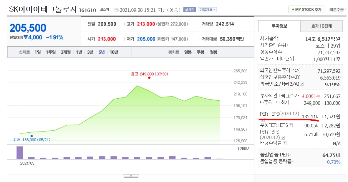지난 5월에 상장후에 호재인 MSCI(모건스탠리캐피털인터내셔널) 한국지수에 편입됐다는 소식에 상승세를 기록하고 있습니다. 그러나 현재는 PER 135배 수준의 고평가 구간에 있습니다. 물론 위에서 설명한 전고체배터리 문제만 없다면 분할매수 해볼 만한 성장주임에는 분명하지만, 미래에 별 장애물도 없는 좋은 성장주가 많은데 굳이 투자해야 하나 라는 생각도 들긴합니다. 하여튼 현재는 고평가 구간이고, 향후 테이퍼링이나 금리인상후에 적정주가로 안정되는 것을 확인후에 분할 매수하는 것을 추천합니다