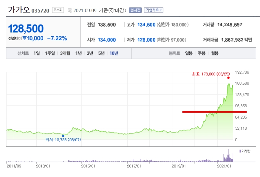 카카오 같은 경우에는 단기간에 계열사수가 급속이 늘었습니다. 골프와 영어교육 사업 등 기존 카카오의 강점과 시너지를 내기 어려운 분야에도 손을 뻗쳤습니다.카카오의 신사업이 대체로 국내 사업에 치중돼 있다는 점에서 뒷말도 나오고 있습니다. 문제는 해외로 진출하는 것이 아니라 국내에서 골목상권까지 문어발을 뻗친다는 비판이 곳곳에서 나오고 있는 상황입니다. 이런 우려의 목소리는 정치권에서 언제까지 외면하지는 못할 것입니다. 향후 다양한 방법으로 정부의 규제의 칼날을 들이 댈것으로 충분히 예상가능합니다. 지금 네이버나 카카오의 차트를 보면 단기간에 너무 급등한 상황입니다. 이런 급등은 조금의 외부충격에도 급락이 나올 수 있음을 알고 있어야 합니다.