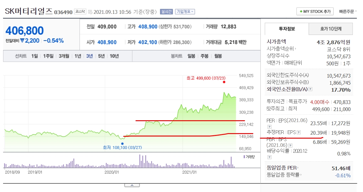 SK머티리얼즈는 반도체나 디스플레이 태양광전지 제조공정에 필요한 특수가스를 제조하는 업체입니다. 반도재 소재인 특수가스는 반도체 공정에 필수적인 소재로 꾸준한 수요가 발생하는 재료입니다. SK머티리얼즈는 작년 기준 영업이익률이 24%에 이르고 있습니다. 즉 엄청난 실적과 성장성을 갖춘 기업이라는 점입니다. 현재 고평가 국면은 아니지만 향후 금리인상등으로 조금은 조정을 받을 우려가 있으니 조금 조정이 나오면 3분할 매수해서 장기로 끌고가는 전략이 유효할 듯 싶습니다.