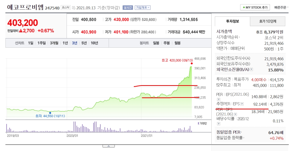투자자가 경계해야할 차트는 단기 급등차트입니다. 급등은 급락을 낳는 법입니다. 아직까지는 돈이 너무 많이 풀려서 조금의 호재에도 급등이 나오니 만큼 긴호흡으로 투자가 필요합니다. 그렇다고 에코프로비엠의 성장성에 의문을 제기하는것은 아닙니다. 어느 정도 조정을 받으면 분할매수로 접근하는 방법을 추천합니다.