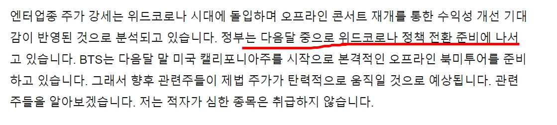 JYP Ent는 작년 실적 296억원, 올해는 420억원을 예상하고 있습니다. JYP Ent는 다른 엔터주에 비해서는 거품의 정도가 약하기는 한데 조금은 고평가된 상황이라고 보여집니다. 장기투자자는 위드코로나 이슈가 어느정도 잠잠해지면 분할매수로 접근하는 전략 추천합니다.