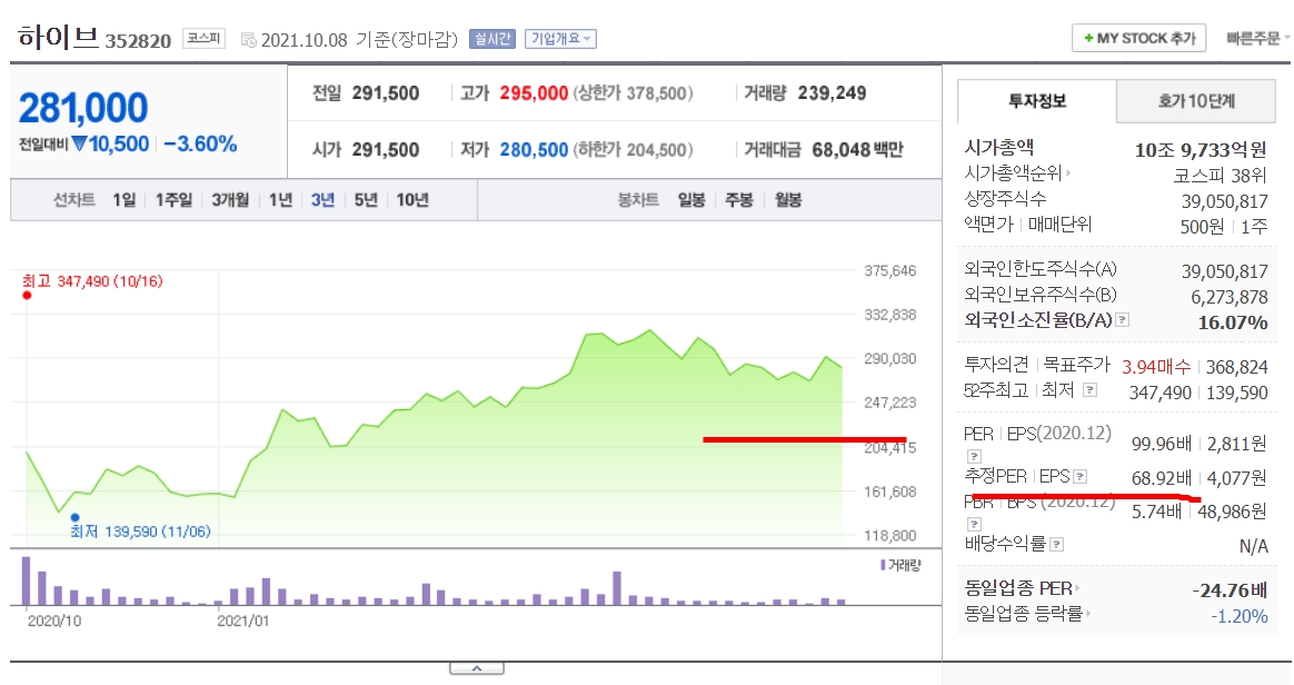 하이브의 설적은 작년에는 870억원 정도 기록하였습니다. 올해는 1500억원대를 기록할 전망입니다. 향후 위드코로나 정책의 시행시에 공연등의 매출이 더 늘어날 것으로 보여집니다. 그런데 실적대비 주가면에서 조금 거품이 끼어 있다는 생각이 듭니다. 위드코로나로 인한 기대감과 방탄소년단의 콘서트 소식이 주가에 거품을 불어넣은듯 보입니다. 장기투자를 원하는 투자자들은 어느 정도 조정을 거치면 분할매수를 권하고 싶습니다.