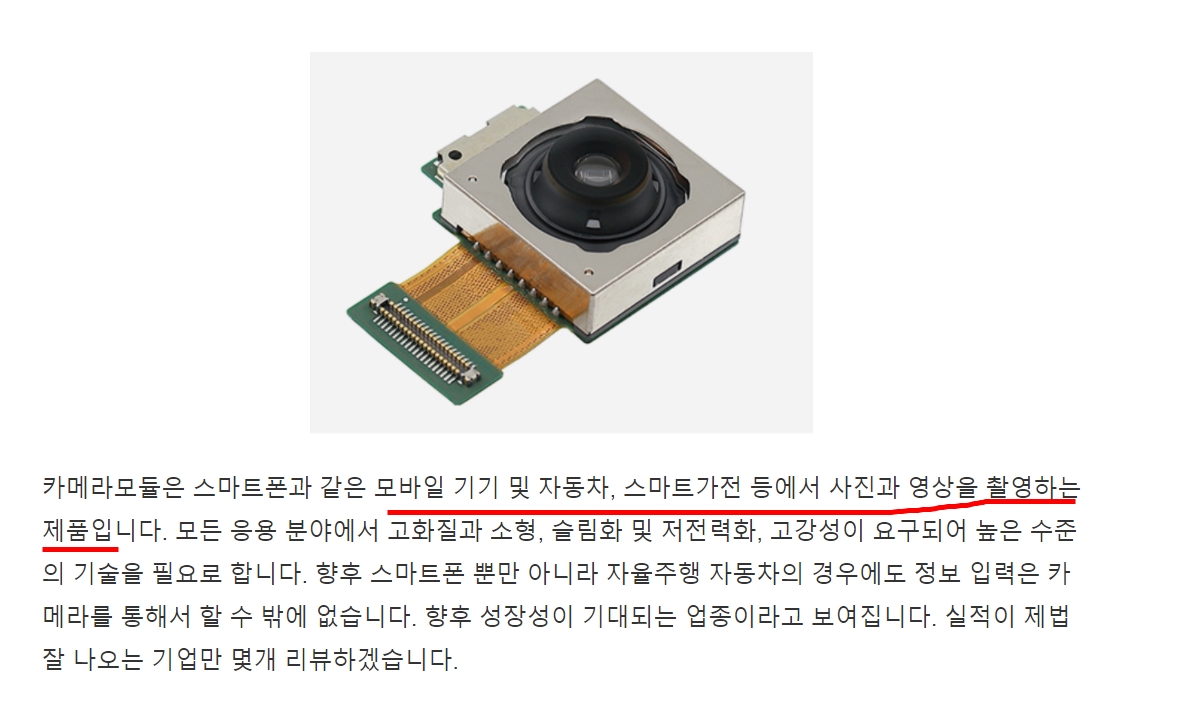 엠씨넥스는 주로 카메라 모듈을 제조하는 한국 기반 회사입니다.엠씨넥스의 제품은 휴대폰용 카메라 모듈, 자동차 카메라 모듈, 적외선 카메라 모듈등으로 구성되어 있습니다. 엠씨넥스는 전방산업 리스크 때문에 부진했던 스마트폰 사업부문과 달리 전장 사업부문은 꾸준한 성장세 및 높은 이익률을 유지했고 하반기부터 시작되는 스마트폰 사업부문이 회복이 전망됩니다.