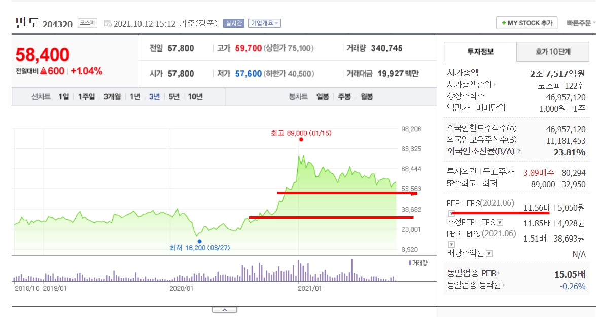 만도는 2020년에 코로나 펜데믹으로 인해서 주가가 급락하였으나 각국의 금리인하등의 경기부양책으로 급등한 바 있습니다. 그리고 최근의 재정축소 움직임으로 인해서 주가가 조정을 받는 형국입니다. 현재 실적대비 주가는 고평가 구간은 아니라고 보여집니다. 하지만 향후 각국의 돈줄쪼이기와 물적분할로 인한 투자자의 실망매물, 현재 박스권과 하단 지지선 사이의 큰 갭등의 이유로 좀더 조정을 받은후에 진입하는 것이 현명할 듯 싶습니다. 최소한 소액으로만 진입을 해야 합니다. 앞으로 인플레로 인한 긴축재정으로 인해서 주가는 상당부분 조정을 받을 가능성이 큽니다.