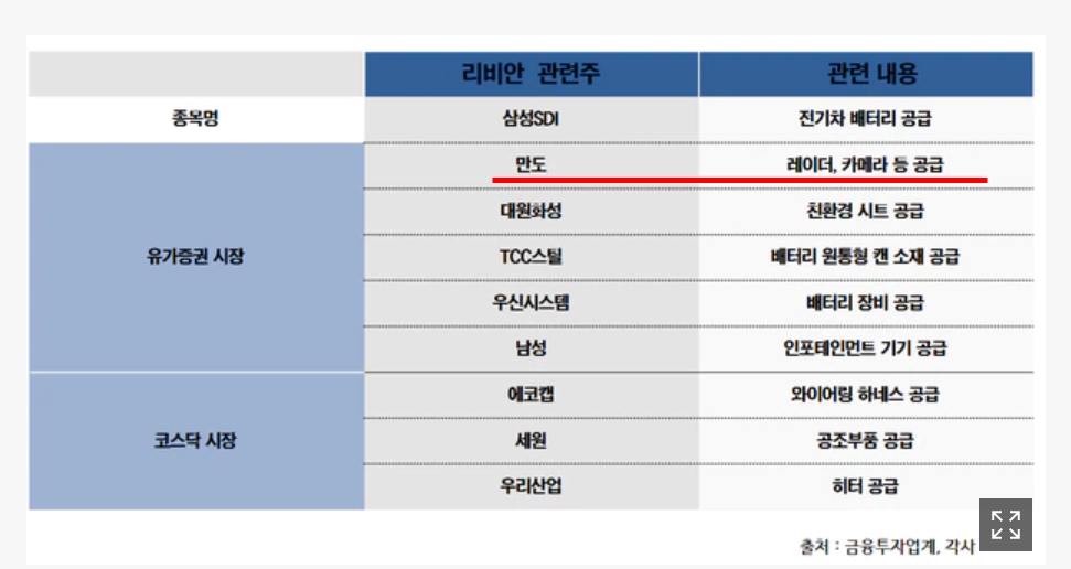 만도는 리비안에 전방 레이더·카메라, 긴급 제동장치 등을 공급하고 있습니다. 만도가 자율주행 기능인 ADAS(첨단운전자보조시스템)를 개발하고 있어서 향후 리비안과 협력여부도 유심히 살펴볼 필요가 있습니다.