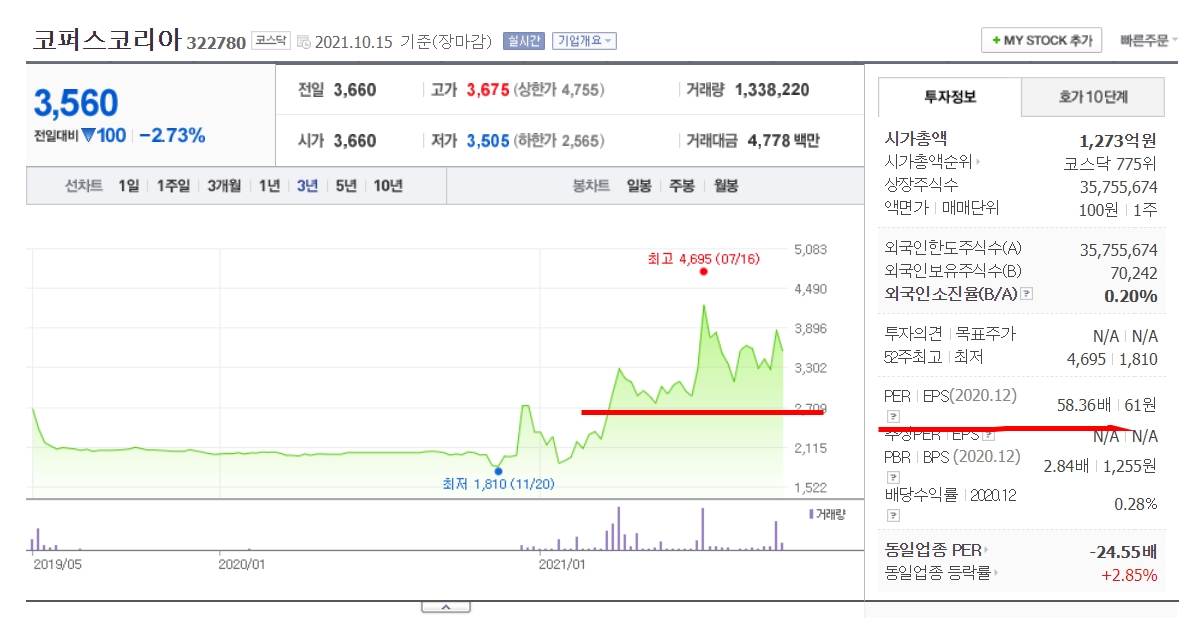 코퍼스코리아는 현재 실적과 향후 성장성이 예상되는 좋은 종목입니다. 단지 밸류에이션이 다소 높은 관계로 하단 지지선에 닿으면 분할 매수로 대응하면 될 것 같습니다.