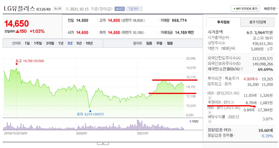 LG유플러스는 실적은 성장 했으나 단기 급등하기에는 종목이 너무 무겁고, 지속적 우상향 하기에는 성장성이 크지 않습니다. 차트에 그려진대로 박스권매매를 추천합니다.
