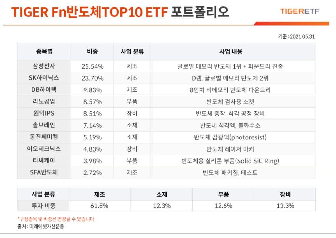 세부 포트폴리오에는 DB하이텍, 리노공업, 원익IPS, 솔브레인, 동진쎄미켐, 이오테크닉스, 티씨케이, SFA반도체 등 내로라하는 국내 반도체 대표 기업들이 담겨 있어요. (2021.05.31 기준) 사업 분류 비중은 제조업(61.8%)이 가장 많고 소재(12.3%), 부품(12.6%), 장비(13.3%) 순으로 반도체 산업 전반에 골고루 투자하고 있습니다.
