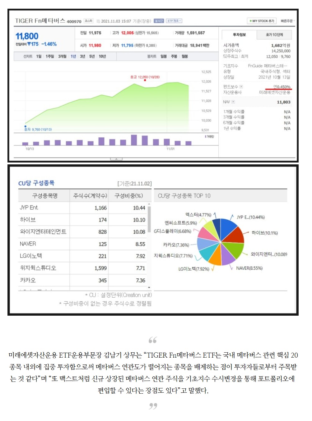 KODEX펀드는 액티브펀드라서 FnGuide K-메타버스 지수를 무조건 추종하지 않고 펀드매니저의 재량이 많이 작용할 수 있습니다. 하지만 TIGER펀드는 위의 지수를 그대로 추종한다고 보면 됩니다. 두 펀드의 추종종목과 비율이 좀 다르다는 것을 알 수가 있습니다. KODEX펀드는 소형주가 상대적으로 많아서 주가의 요동이 좀 심할 것이고, TIGER펀드는 대형주 위주라서 주가의 탄력을 떨어지지만 안정성이 낫다고 보면 됩니다.