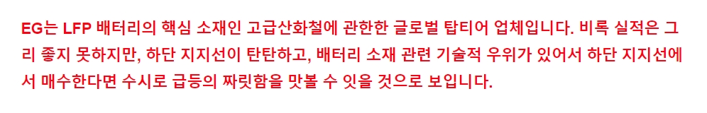 EG는 산화철의 제조 및 판매를 영위하는 한국 기반 회사입니다. EG는 세 개 부문을 통해 사업을 운영하고 있습니다. 산화철부문은 자성재료용 산화철과 페라이트 코어용 복합재료를 생산합니다. 무역부문은 금속무역과 일반무역 등 서비스를 제공합니다. 엔지니어링부문은 환경플랜트 등 플랜트를 건설합니다. EG는 LFP 배터리의 주요 원료 중 하나인 고급산화철을 취급하는 기업으로 세계시장에서 15% 점유율을 보이고 있습니다.