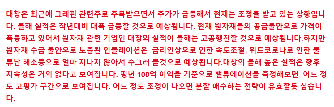 대창은 비철금속 제품을 제조하는 한국 기반 회사입니다.대창의 제품에는 쾌삭 황동 봉, 단조 황동 봉, 고력 황동 봉, 무연내식 황동, 무연 황동, 양극동 등이 있습니다. 대창의 제품은 반도체, 전기, 전자, 자동차, 선박, 산업용 기계 등 산업의 원재료로 사용됩니다. 대창은 지난 2014년 한양대와 공동으로 그래핀 응용 연구 개발을 추진해 최근 그래핀 자기조립 박막 코팅 기술 연구를 완료했습니다.