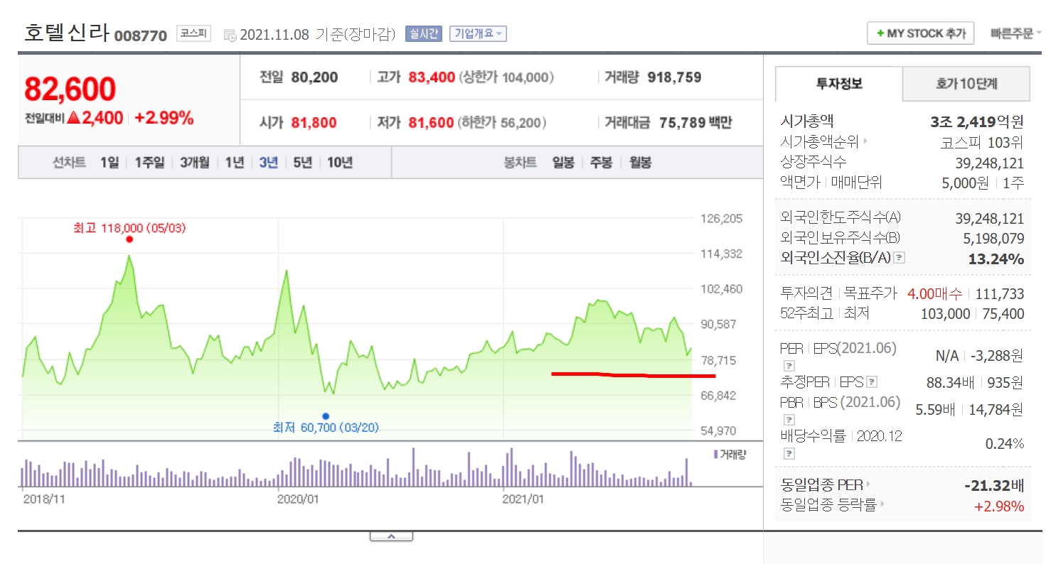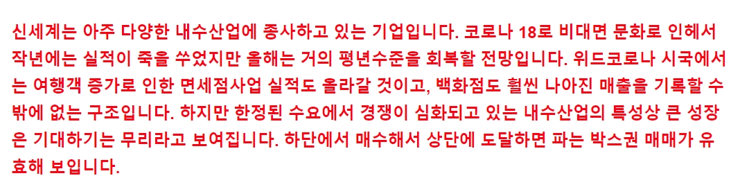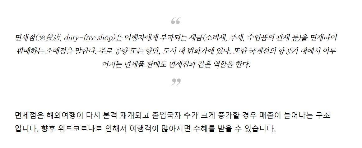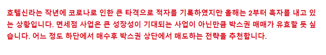 호텔신라는 주로 면세점을 운영하는 한국 기반 회사입니다. 호텔신라는 두 개 부문을 통해 사업을 운영하고 있습니다. 면세점부문은 부티크 아이템, 패션, 보석류, 화장품, 시계 등을 제공하는 신라면세점 브랜드로 면세점을 운영합니다. 호텔 및 레저부문은 객실판매, 식음료 판매, 레포츠사업 및 기업 출장 관리인 레저사업 등을 영위하고 있습니다..호텔신라는 백신 접종률이 상승하면서 의무 격리가 면제되는 국가들이 갈수록 증가하고 있는 현 상황에서, 연말로 갈수록 2022년에 관광객 매출이 정상화될 것이란 기대감은 더욱 고조될 것으로 예상됩니다.