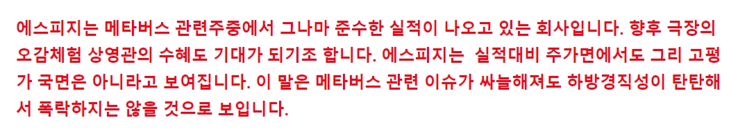 에스피지는 CJ CGV 4DX(오감체험 상영관)에 유성감속기를 독점 공급하고 있는데 최근 가상현실 시장이 급성장하면서 수혜가 기대되고 있습니다. 에스피지가 공급하는 정밀제어 기능을 갖춘 유성감속기는 가상현실을 몸으로 체감하기 위한 시뮬레이터 4DX체어를 구동하는 핵심부품입니다.