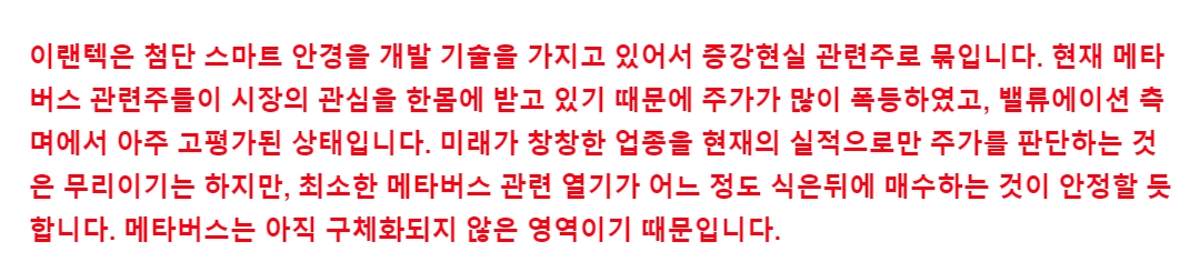 이랜텍은 2012년부터 2015년까지 미래창조부 국책과제로 진행된 증강현실과 가상현실(VR)을 구현하는 첨단 스마트안경 단말기 연구사업 개발에 참여, 관련 기술을 축적했습니다.