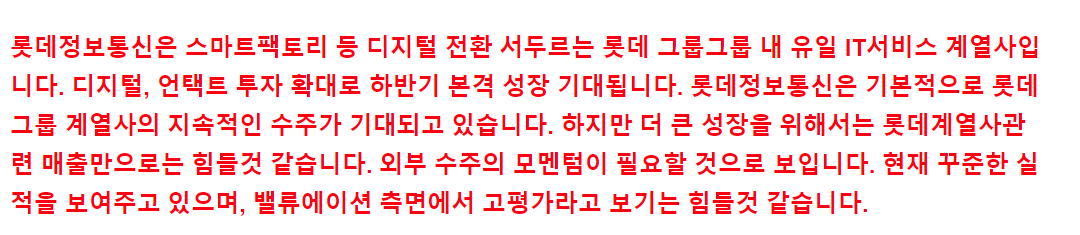 롯데정보통신은 주로 유통, 서비스, 제조, 금융 서비스 등 분야에서의 시스템 통합 구축 서비스 제공에 종사하는 한국 기반 회사입니다.롯데정보통신은 자회사들과 함께 두개 부문을 통해 사업을 운영합니다. 시스템통합부문은 고객의 니즈를 기반으로 정보시스템을 설계하고 구축합니다. 또한 이 부문은 전산장비의 납품, 애플리케이션 서비스 제공사업 및 유지보수사업을 영위합니다. 시스템관리부문은 전산시스템 운영과 관리 서비스를 제공합니다.