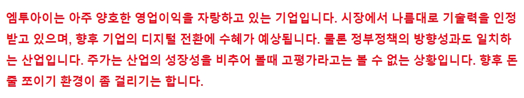 엠투아이의 주요 제품인 스마트HMI, SCADA는 스마트팩토리 구현에 필수적인 요소로 엠투아이는 20년 업력을 바탕으로 업계 최다 라이브러리(400개)를 보유 중입니다. 전방산업은 반도체, 2차전지, 디스플레이, 자동차 및 공공기관으로 다양화, 하반기 주요 전방산업 설비(Capex)투자 증가로 수혜가 예상됩니다. 엠투아이는 정부정책(중소기업 스마트 혁신 제조전략, 디지털 뉴딜 2.0 등) 모멘텀과 세계적인 트렌드(리쇼어링)로 영업환경이 호조세를 나타내고 있습니다