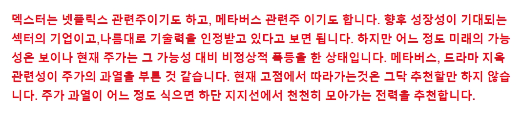 덱스터는 위드 코로나 전환으로 영화·드라마 업계가 회복될 시 우호적인 사업 환경에 힘입어 외형 성장을 기대해볼 수 있을것 같습니다. 71억원을 투입해 OTT용 DI(색 보정 등 교정 작업 전반)와 음향 스튜디오(25억원), 버츄얼 프로덕션 스튜디오(46억원)를 구축했는데, 이는 영화와 드라마뿐 아니라 메타버스, 게임 등 전방산업 수주 물량 확보에 긍정적인 요소입니다. 덱스터는 ‘지옥’의 시각특수효과(VRX)를 담당하였습니다.