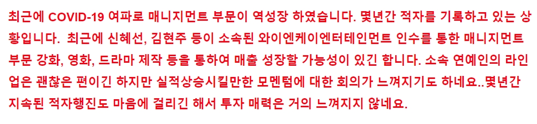 제이콘텐트리는 엔터테인먼트 사업에 영위하는 한국 기반 회사입니다. 제이콘텐트리는 두 개 주요 부문을 통해 사업을 운영합니다.방송부문은 주로 드라마, 방송용 프로그램의 제작 및 콘텐트의 유통 등 사업을 영위합니다.영화부문은 영화 극장을 운영합니다. 제이콘텐트리는 지옥을 제작한 클라이맥스스튜디오의 모회사입니다. 지난 8월말 넷플릭스 오리지널 디피(D.P)를 선보이면서 흥행에 성공 하였고, D.P 이후 지옥이 클라이맥스 스튜디오의 두 번째 작품으로서 3분기에 국내외 합산 90억원의 손실이 발생한 제작 자회사들의 실적이 개선될 것으로 기대됩니다.